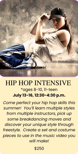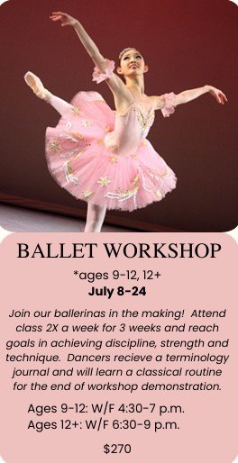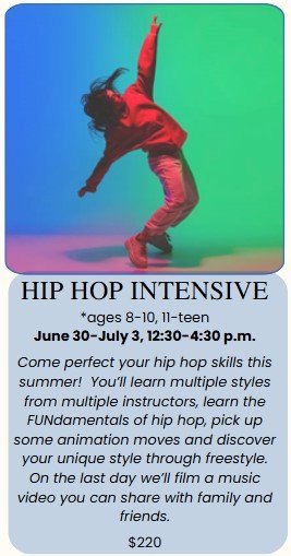 School year classes run from mid August to the end of May, with a late May recital to end the season. Tuition is pro-rated in Aug. to your start date, but charged in full for Sept – May. Some months you’ll receive 5 classes for the price of 4, some months you’ll receive 2-3 classes for the price of 4, depending on how the calendar shakes out. Summer programs offer 4-day dance camps and 2-week workshops, spanning June and July. Register separately for summer programs.
